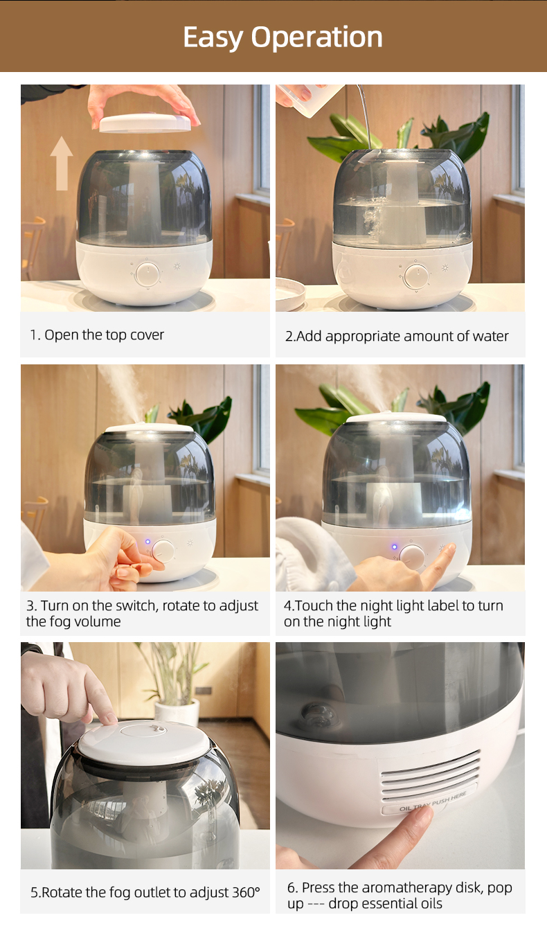 Naš novi ultrazvučni aromaterapijski ovlaživač zraka velikog kapaciteta od 5 l, električna kućna uporaba u hotelu čini vašu upotrebu sigurnijom i intimnijom. Mekši je od konvencionalnih ovlaživača i ne ometa vaše učenje, rad i odmor. Punjenje vrha spremnika za vodu, praktično i brzo, prozirni spremnik za vodu, može se vidjeti razina vode. Nano-fina maglica 300 ml/h, maksimalna maglica može raditi 8 sati, minimalna maglica može raditi 50 sati, može dodati aromaterapiju za smirivanje vašeg raspoloženja. Tijelo ovlaživača je opremljeno neovisnim noćnim svjetlom, tako da je vaša noć puna sigurnosti.